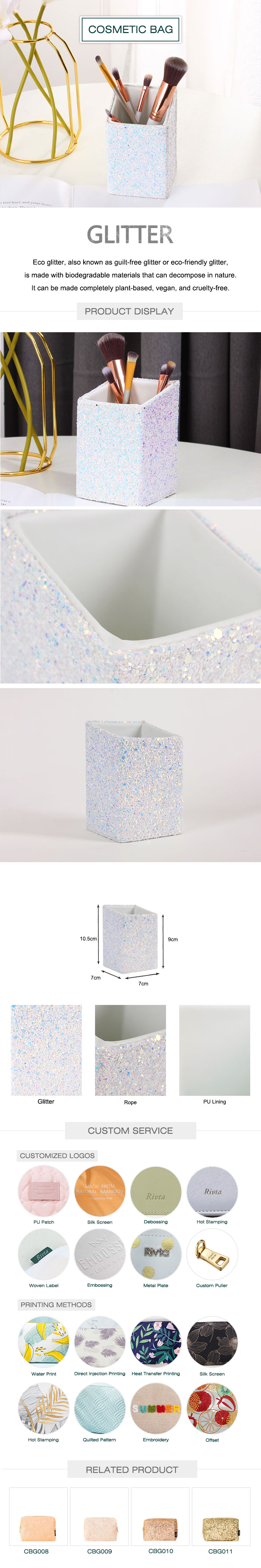 This brush bag is made of good quality glitter, shining, special design and color, fashionable design, suitable for women. Size: 7cm X 7cm X 9/10.5cm. It can be customized as per your requirements. Such as size, logo, shape, etc.
