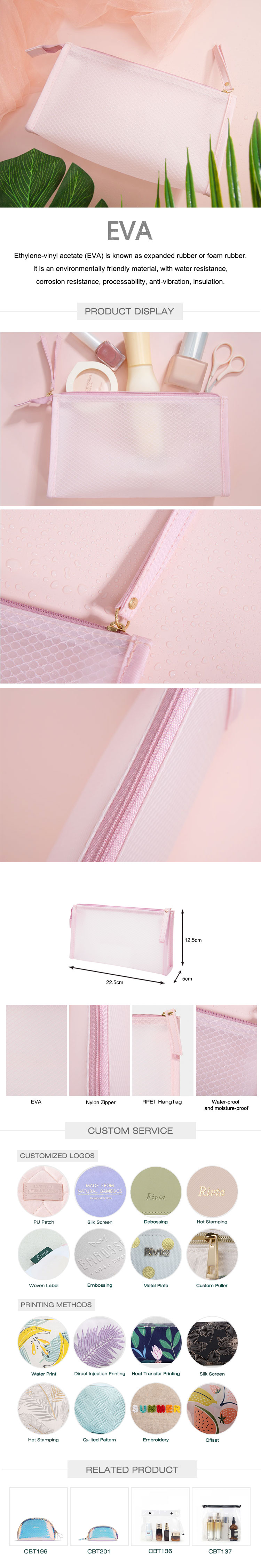This EVA cosmetic bag is beautiful in color, moderate in size, simple in structure, waterproof, moisture-proof, and Dirt-resistantThe semitransparent material makes it easier to find the contents. It has lightweight, so easy to carry them around.